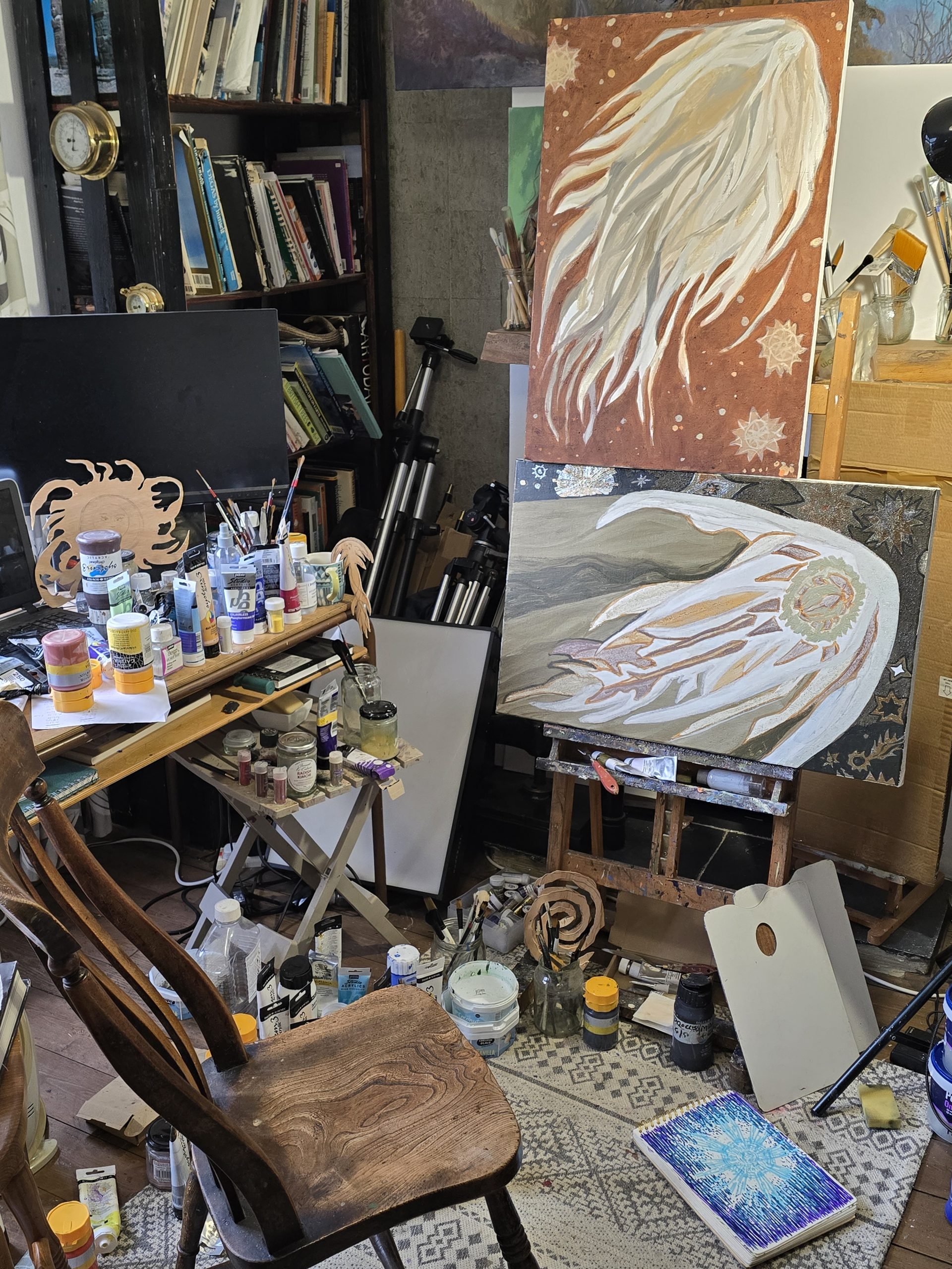 artist James Tovey studio view showing his easel with two paintings on it and some of the materials and models used around about. 2025.